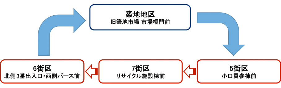 豊洲市場内を循環するバスは、5街区(青果棟)は小口買参棟前、7街区は管理棟前と水産卸売場棟にあるリサイクル施設棟前、6街区は水産仲卸売場棟の西側バース前はこれまで通りですが、北側2番出入口の停留所は、北側3番出入口となります。
