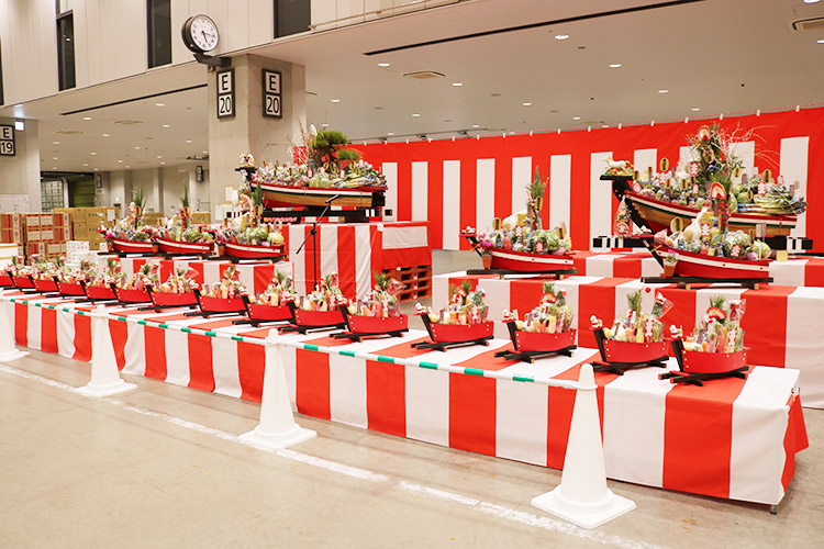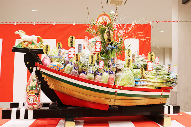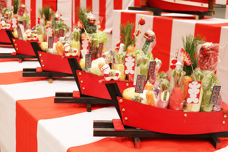 その後、五穀豊穣や商売繁盛を願い、たくさんの野菜や果物を盛り込んだ宝船が、鐘の合図とともに、次々と競り落とされました。