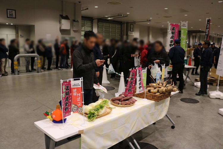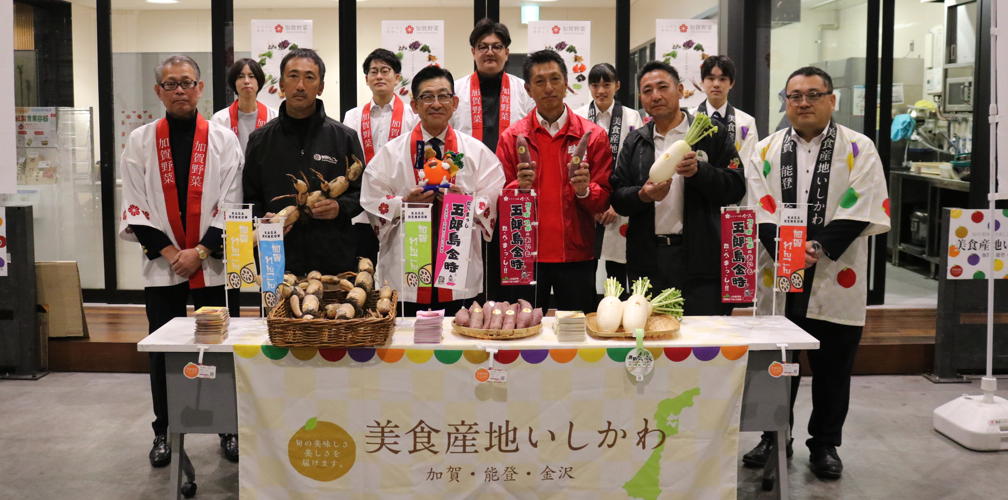 今回はその中から、源助だいこん・五郎島金時・加賀れんこんの3品目をご紹介いただき、魅力を広く発信するため、産地の皆さまには早朝より豊洲市場へお越しいただきました。
