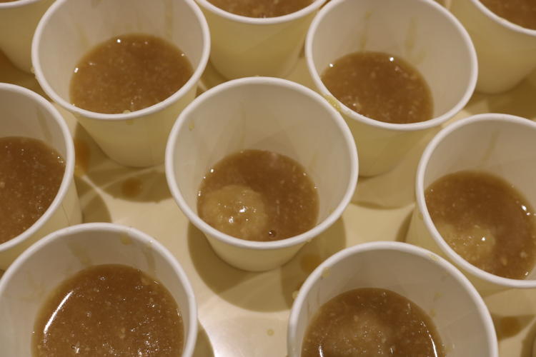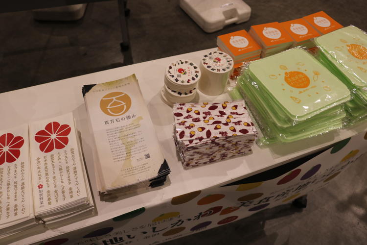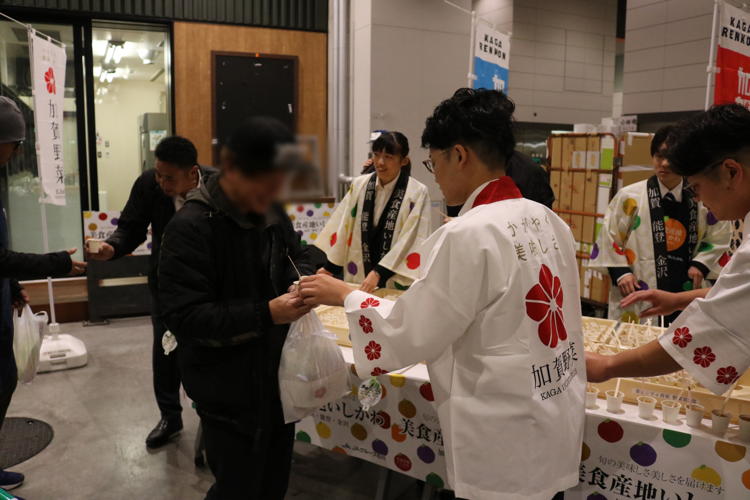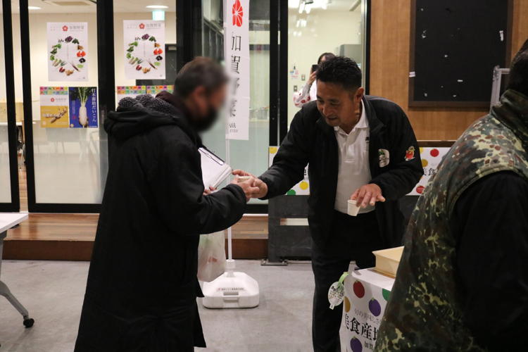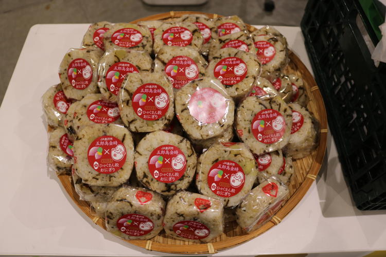 お集まりいただいた皆さまには、加賀れんこんのすり流し汁と源助だいこんのおでんの試食が振舞われ、五郎島金時×ひゃくまん穀のおにぎりとオリジナルグッズが配布されました。