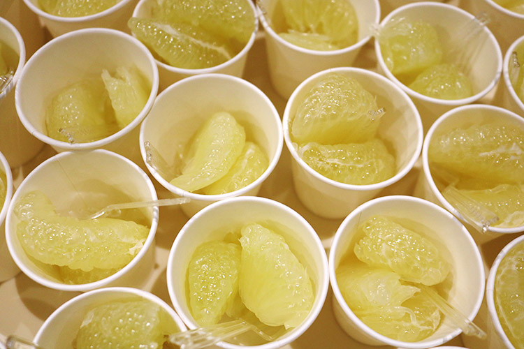 お集まりいただいた皆様には、リーフレットと文旦1玉のプレゼントに加え、一口サイズに剥いた文旦の試食が振舞われました。一粒一粒がしっかりとしていて、プリッとした食感。爽やかな香りと、甘みと酸味のバランスの良さが印象的で、思わず何個も手が伸びてしまう美味しさでした。