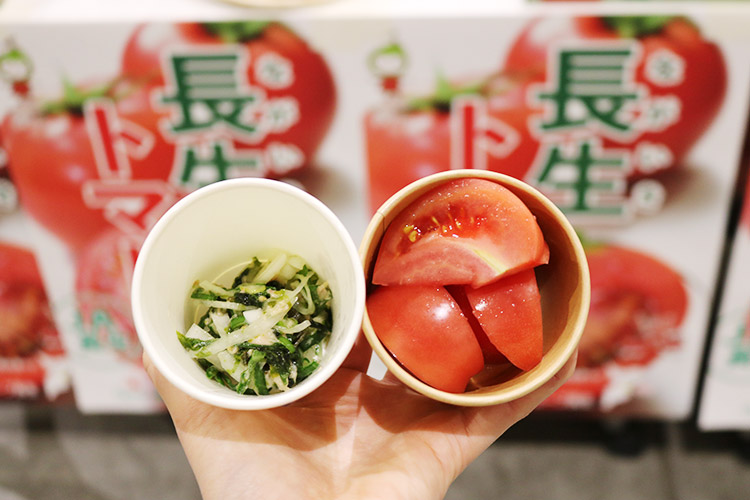 試食として、「長生(ながいき)トマトと葉玉葱の春結び」が提供されました。
