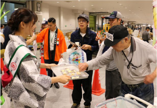 あいさつが終わり、2019年岩井ねぎキャンペーンガールの津田和美さんや地元の女性の皆さんが、浴衣を着て試食を配りました。