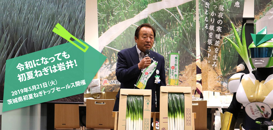 5月21日(火)、豊洲市場青果卸売場で「茨城県初夏ねぎトップセールス・浴衣DE試食キャンペーン」が、坂東市の木村敏文市長、JA岩井の風見晴夫組合長らが出席して開催されました。茨城県は夏ねぎの出荷量、作付面積、s収穫量ともに全国1位を誇り、中でもJA岩井は県内トップの夏ねぎ産地です。