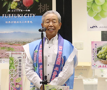 「今年も桃、すもも、ハウスぶどうをお取り扱いいただきありがとうございます。そしていよいよシャインマスカットの本格的な出荷が始まる時期です。今年は当組合で2800tの出荷を計画しているので、少しでも豊洲での取り扱いを増やしていただければありがたいです。農家の努力で非常に良い仕上がりになっており、安全性にも十分配慮しているので消費者の皆様に安心して食べていただけます。」