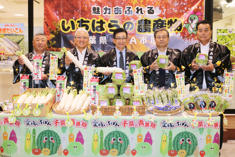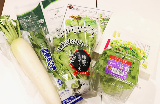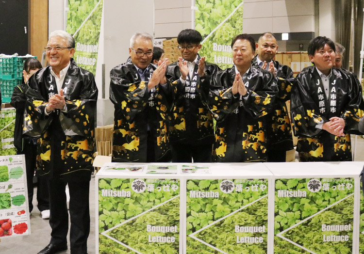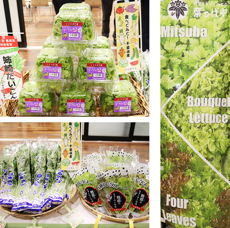 場内には、JA市原市の大根と有限会社葉っぱやのブーケレタス、フォーリーブス、三つ葉が展示されました。