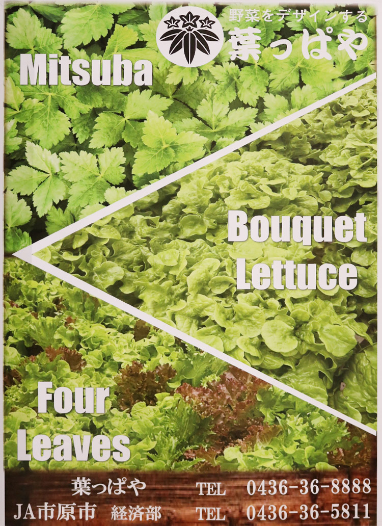 10月から5月まで出荷される「姉崎だいこん」は、みずみずしく甘みがあり、その美しさから”白いダイヤ”とも称されます。(有)葉っぱやは”野菜をデザイン”するという理念のもと、様々な農産物を生産されています。通常の2倍の厚さのあるパックは、「ブーケレタス」の美しい形を損なわず保存性を高めるために特別に開発したものとのことです。
