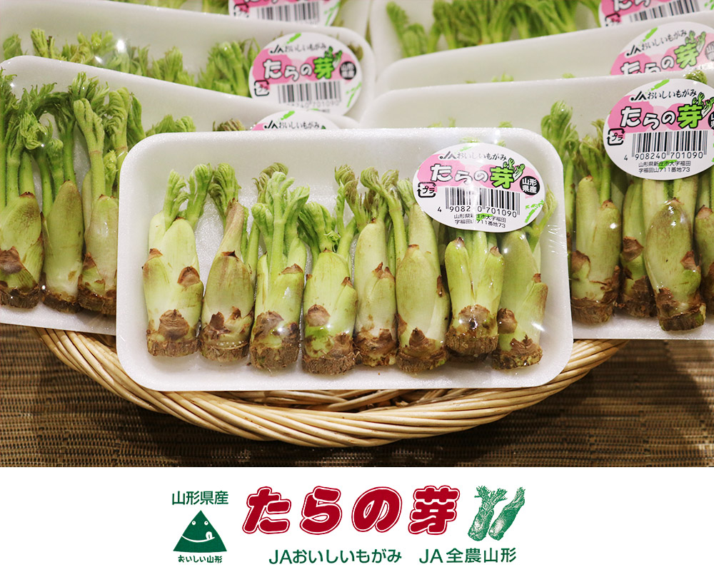 山菜の王様「たらの芽」は「たらの木」の新芽の部分で、アクが少なくほのかな苦みとホクホクとした食感が特長。山形県では春を先取りする促成栽培を早くから取り入れ、全国1位の生産量を誇っています。