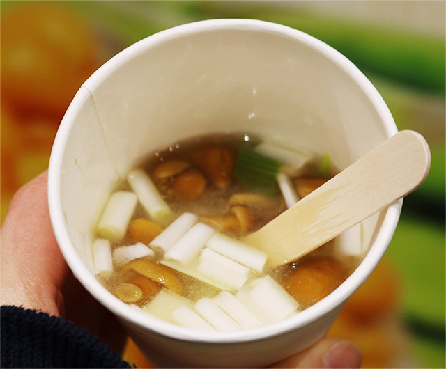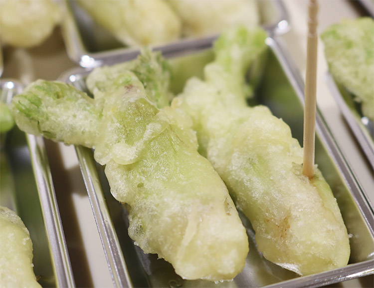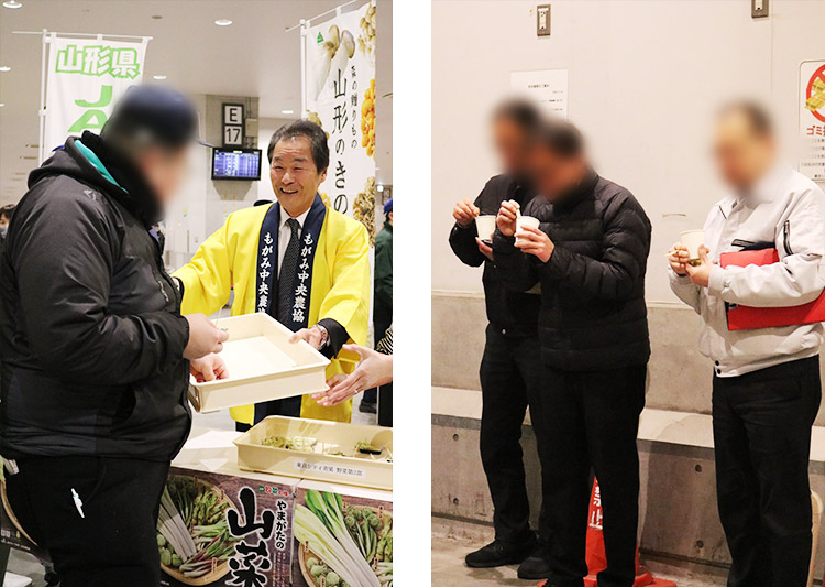 お集まりいただいた市場関係者の皆様には、「たらの芽の天ぷら」と「うるいの味噌汁」の試食が振舞われました。天ぷらは揚げたて!さっくりふわふわの衣にたらの芽のホクホク食感とほろ苦さがたまりません。うるいとなめこの粘り気がマッチし、優しい味の味噌汁は、冷えた体に沁みます。試食された方にお話しを伺うと、「やっぱり天ぷらはうまい!」「うるいを刻むのもありだね」と大好評でした。