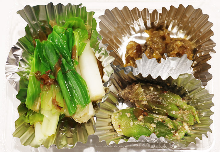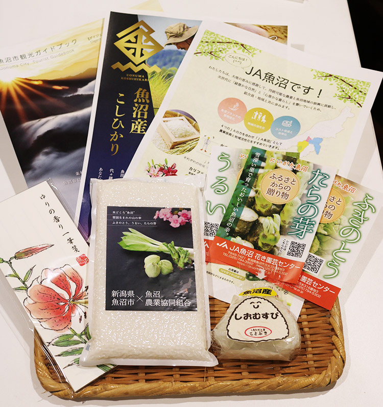 お集まりの皆様には、たらの芽の胡麻和え・うるいのお浸し・ふきのとう味噌の試食に加え、魚沼産コシヒカリ2合と塩むすび・魚沼ゆりの香り一筆箋セットの豪華プレゼントが配布されました。素材が際立つ優しい味で、ご飯が何杯でも食べられそうです。