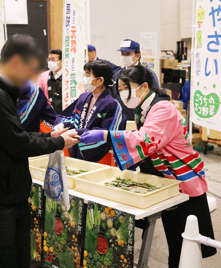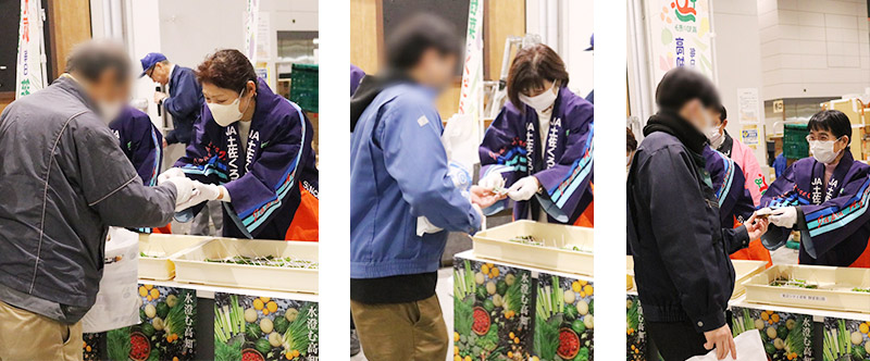 お集まりいただいた場内の皆様には、「無限ししとう」の試食と、ししとう・茗荷・きゅうりセットが配布されました。